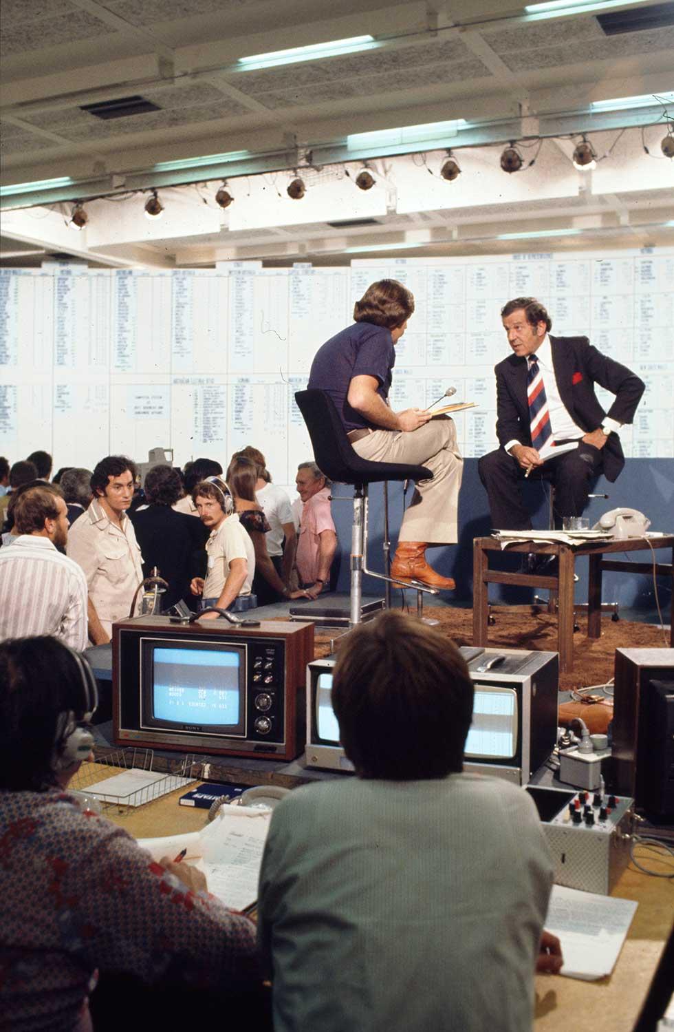 This colour photograph shows Don Chipp, then leader of the Australian Democrats, being interviewed by a television journalist at the National Tally Room in Belconnen High School, Canberra, as the results of the federal election were being recorded on 10 December 1977. The two men are positioned on a raised platform, with Chipp, dressed in a suit, leaning towards the journalist who sits casually with a sheaf of papers in his lap. Behind Chipp is the National Tally Board. People stand on the Tally Room floor watching results on the Board and two men sit behind a desk watching monitors.