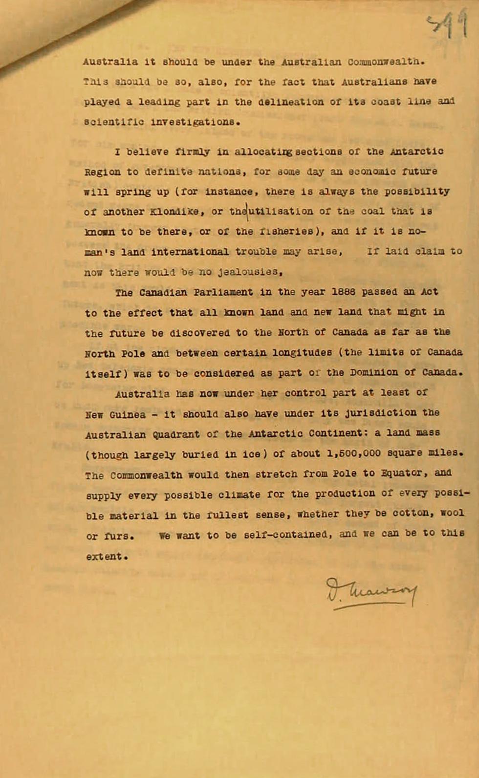 Australia has now under her control part at least of New Guinea – it should also have under its jurisdiction the Australian quadrant of the Antarctic Continent: a land mass (though largely buried in ice) of about 1,500,000 square miles. The Commonwealth would then stretch from Pole to Equator, and supply every possible climate for the production of every possible material in the fullest sense, whether they be cotton, wool or furs. We want to be self-contained, and we can be to this extent.