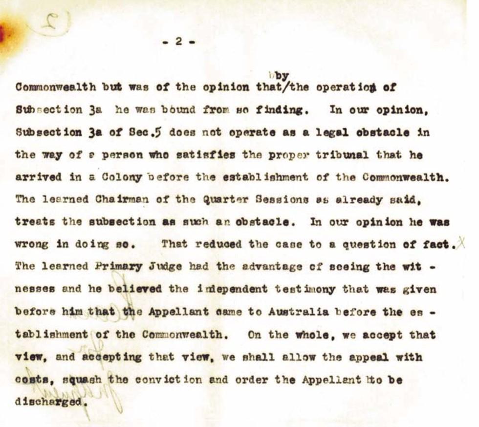 [Speaker:] RICH J. In this case the Appellant was convicted by the Magistrate of being a prohibited Immigrant within the meaning of the Immigration Acts 1901-1903 on the ground that he was an immigrant who had evaded an officer, since the Immigration Restriction Act 1901, and at a time thereafter was required to pass the dictation test and failed to do so. The Magistrate convicted the Appellant and sentenced him to six months’ imprisonment with hard labour. From that conviction the Appellant appealed to the Quarter Sessions and the learned [words crossed out: ‘Primary Judge’, replaced with ‘Chairman’] of the Quarter Sessions upheld the conviction. [Word crossed out: ‘In’, replaced with ‘Both’] before the Magistrate and before the learned Chairman of the Quarter Sessions evidence was given that the case was not rested on the section alone, but evidence was given to show the Appellant was not an immigrant within the meaning of the Act. The learned Chairman of the Quarter Sessions was prepared, I gather from his Judgment, to find that the Appellant had arrive in Australia before the establishment of the
