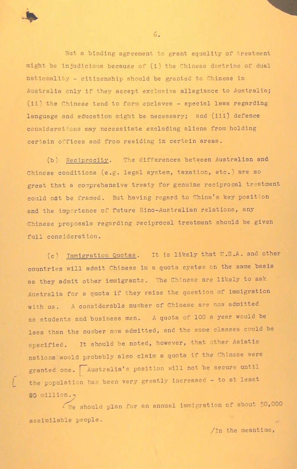 (xiv) The Chinese will probably claim (a) equality of treatment, (b) reciprocity, (c) immigration quotas. Sir F. Eggleston thinks it would be politic to abandon many of the restrictions on the activities of Chinese nationals living in Australia, excepting those ….