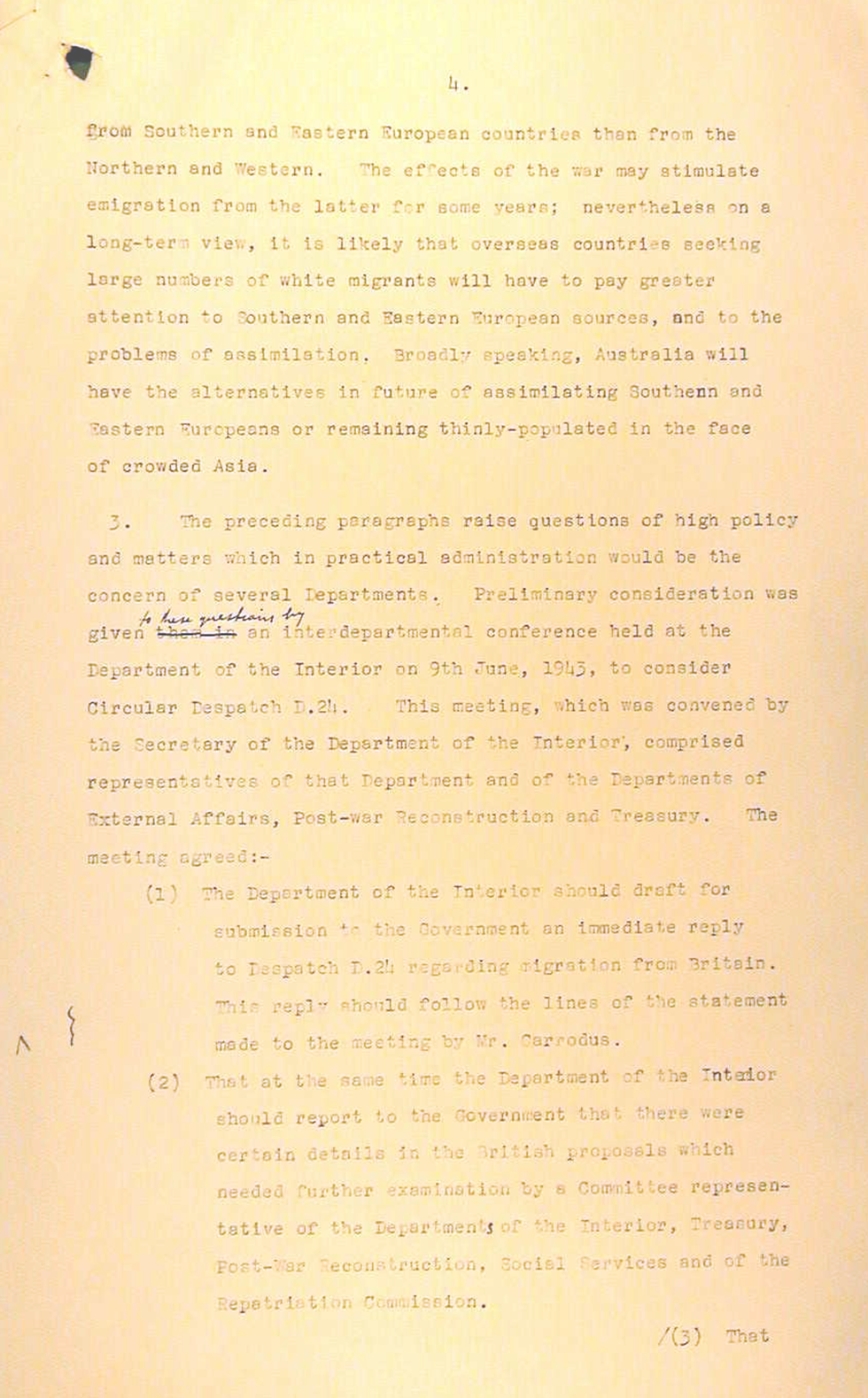 3. The preceding paragraphs raise questions of high policy and matters which in practical administration would be the concern of several Departments. Preliminary consideration was given [crossed out] them in [end crossed out] [handwritten] to have questions by [end handwritten] an interdepartmental conference held at the Department of the Interior on 9th June, 1943, to consider Circular Despatch D.24. This meeting, which was convened by the Secretary of the Department of the Interior, comprised representatives of that Department and of the Departments of External Affairs, Post-war Reconstruction and Treasury. The meeting agreed: -