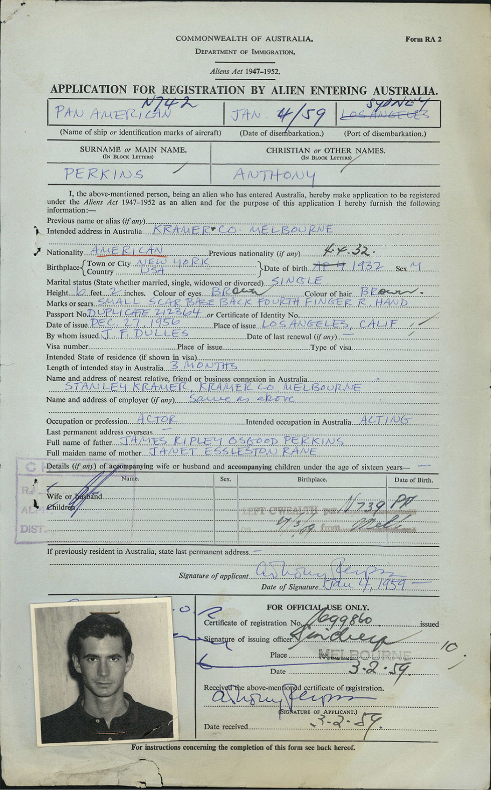 Their arrival in Australia is documented in National Archives' passenger arrival records. In 1959, like now, new arrivals to Australia had to fill in an incoming passenger arrival card with their name, intended length and purpose of stay, and other details. Even better for classic Hollywood fans, these ones also include photos!