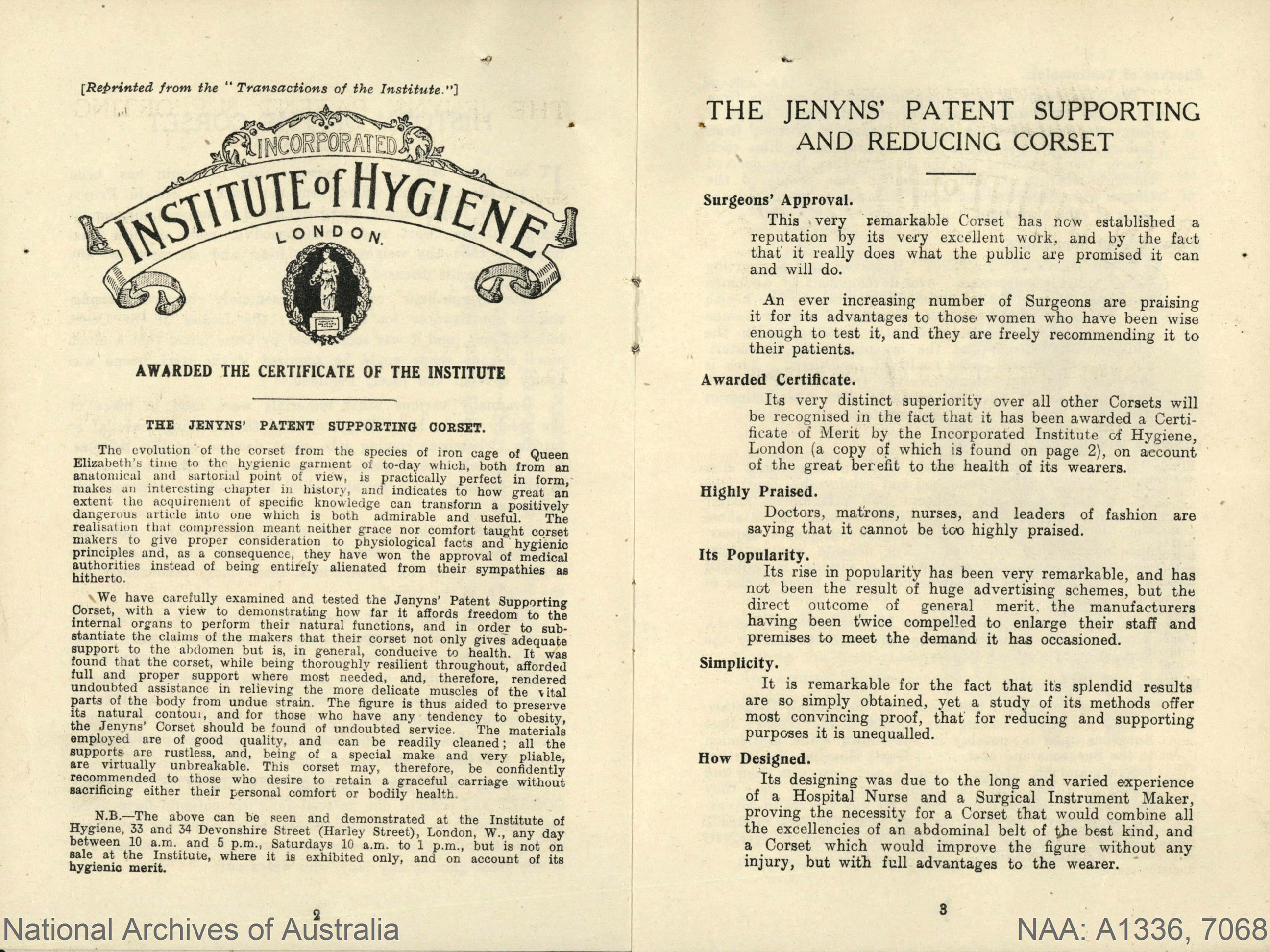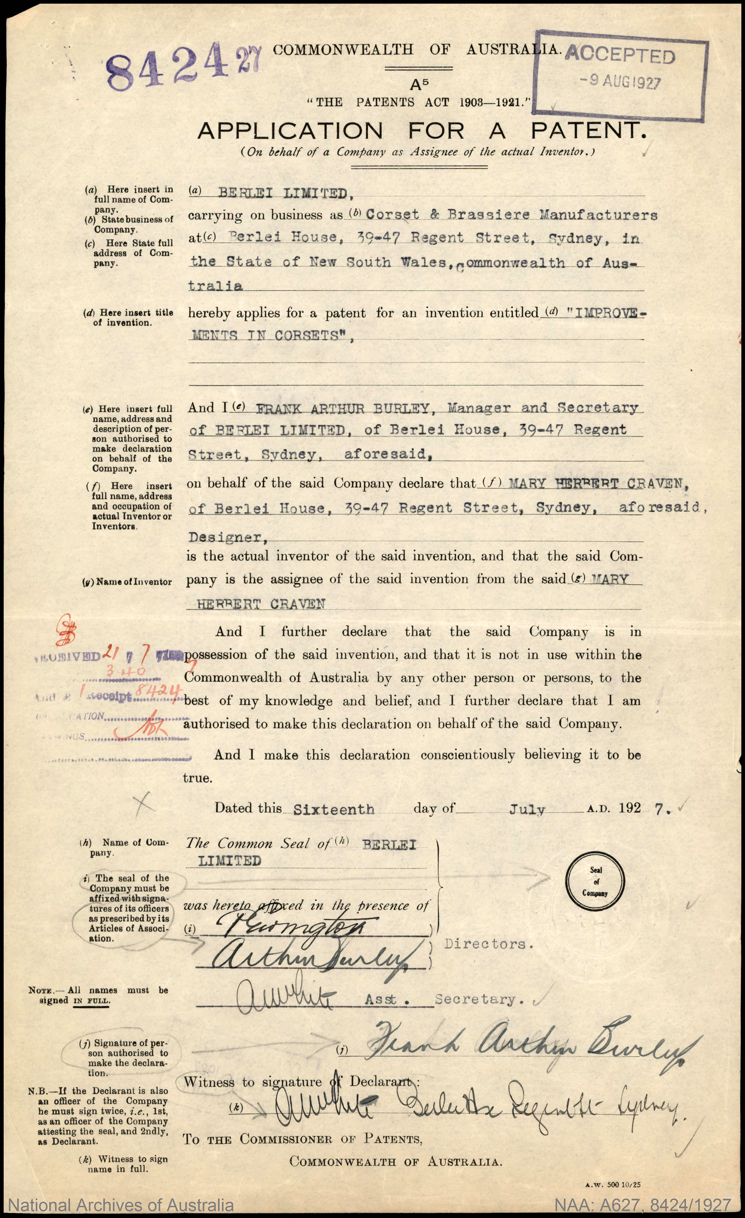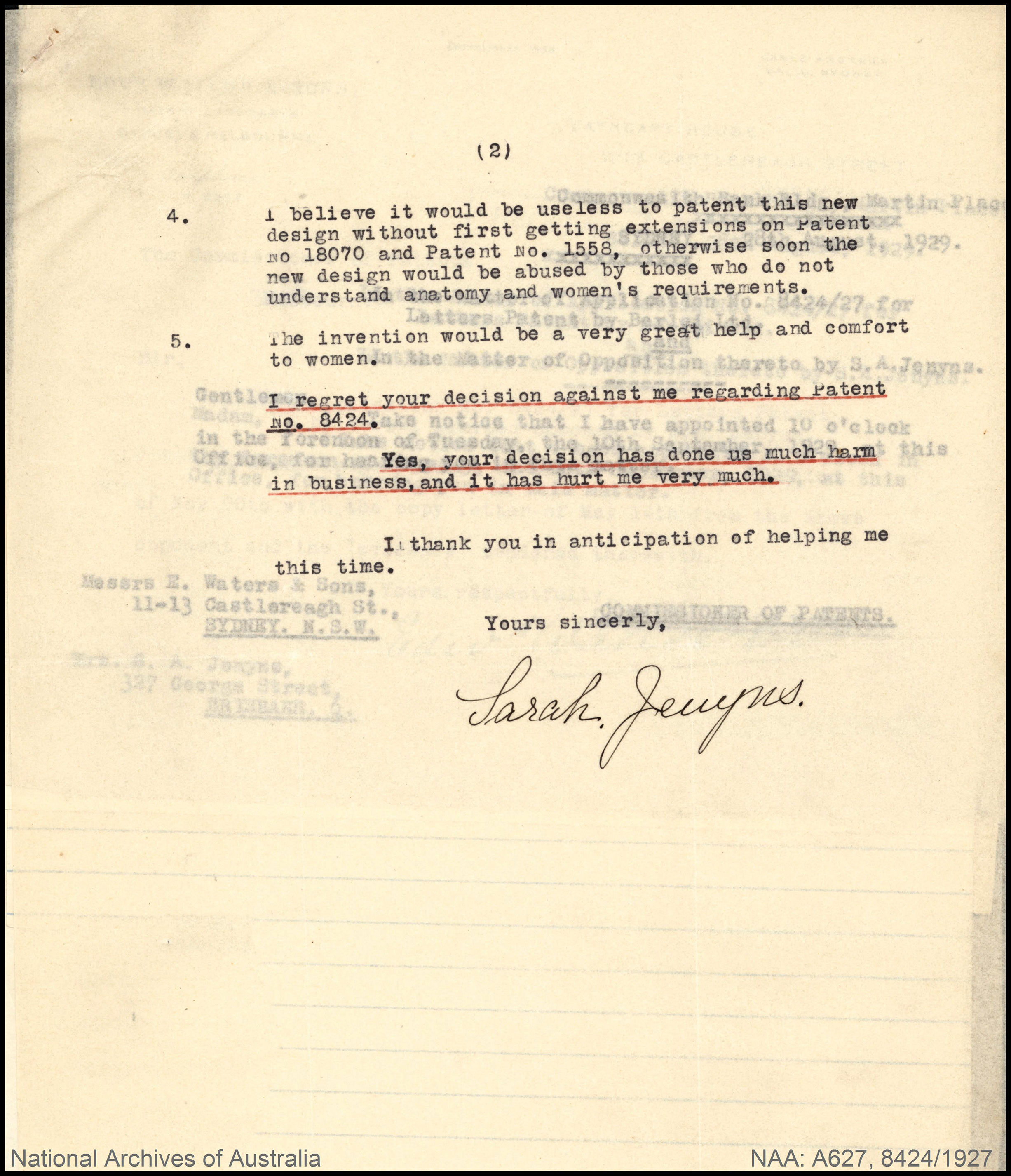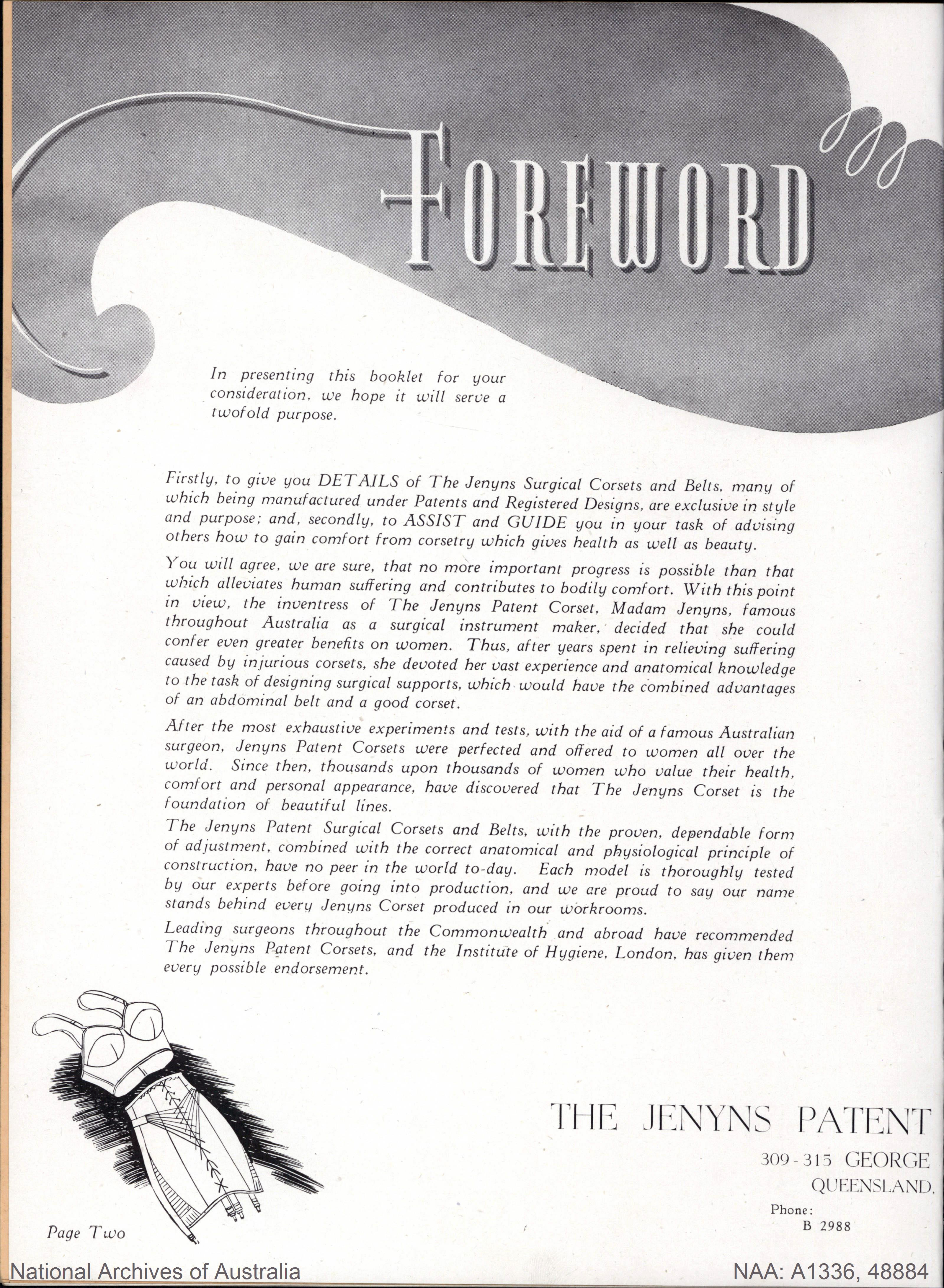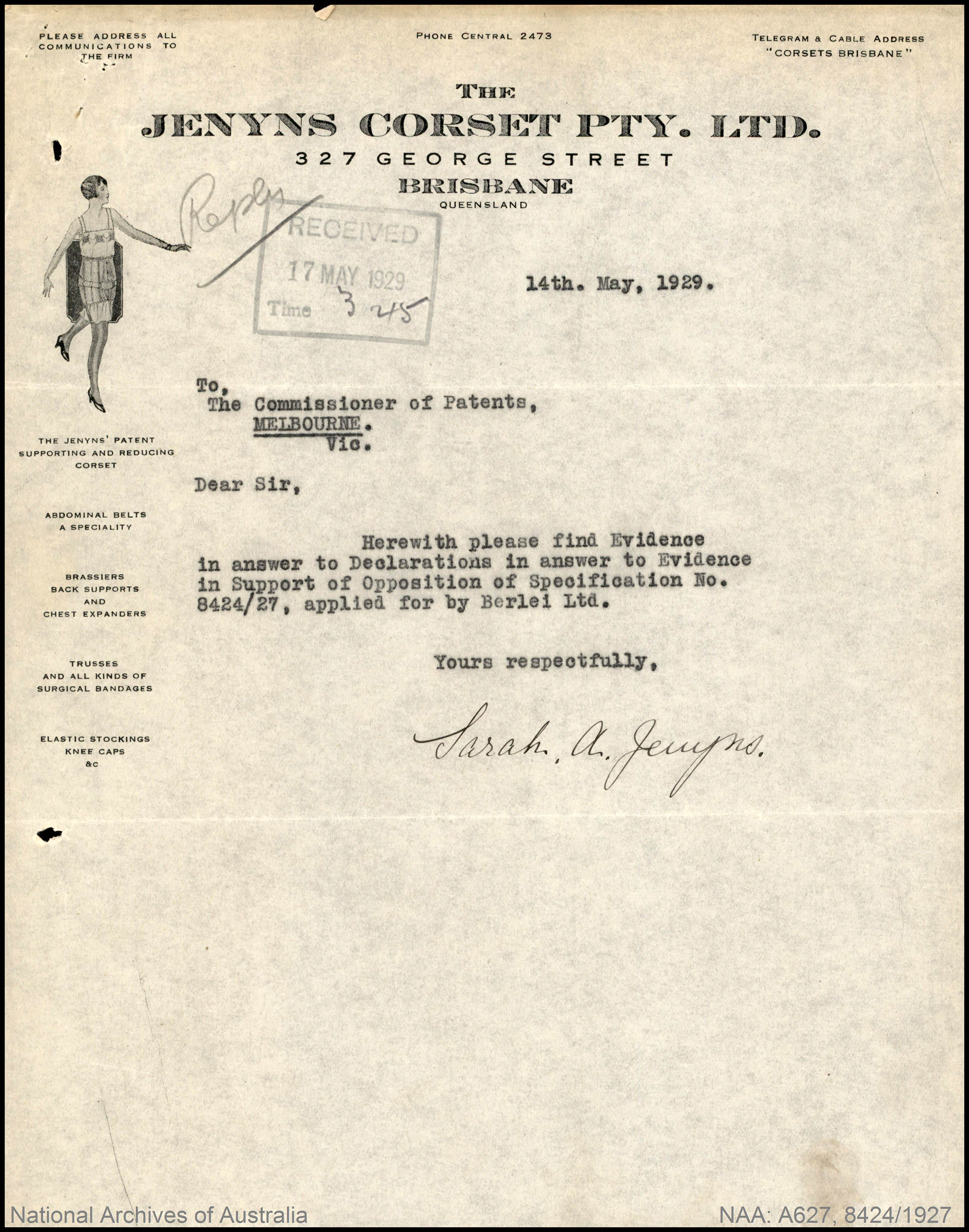 Sarah and her husband started their business selling Sarah's designs in 1907, and by 1909 Jenyns Patent Corsets Pty Ltd was so successful that they had to move to larger premises.