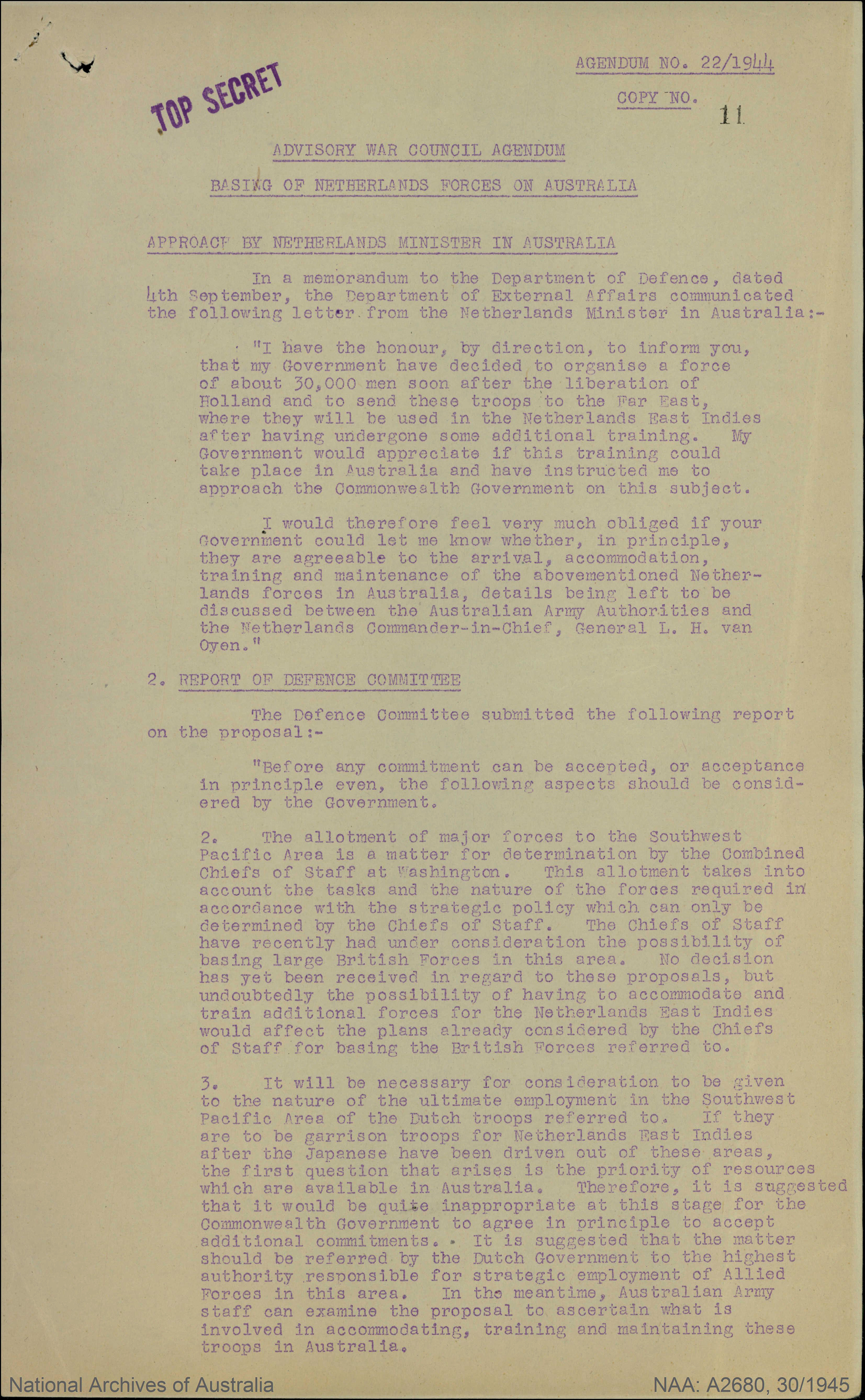 The Netherlands East Indies had fallen to the Japanese in 1942, but by 1943 the Dutch had hopes of taking back control. First, they would need a base to stage their return. The Australian government had just the thing: a vacant United States army camp in Brisbane.