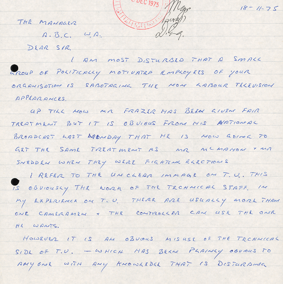The Dismissal stirs arguments, even today, so it’s not surprising that the ABC received a flurry of passionate correspondence in 1975 about the political drama. An ABC file created by the Western Australian regional office and now in the National Archives (titled ‘Letters of complaint – re: political bias – since November 11 1975’) paints a vivid picture of the high emotions and strong opinions of the times.