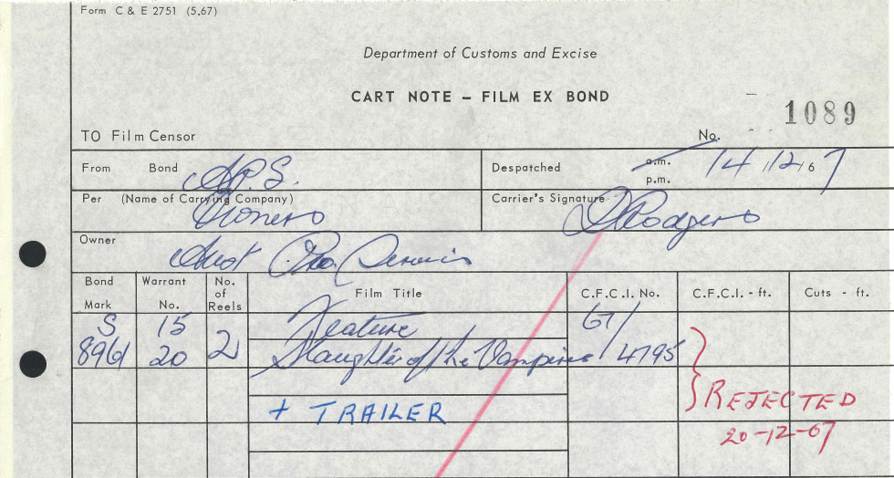 The series ST4129 at the National Archives of Australia hold film importation and censorship documentation from 1951 to 1975. In this series researchers can trace the importation of films and whether they were granted registration. An example of this is in 1967 when the film Daughter of the Vampire was rejected.