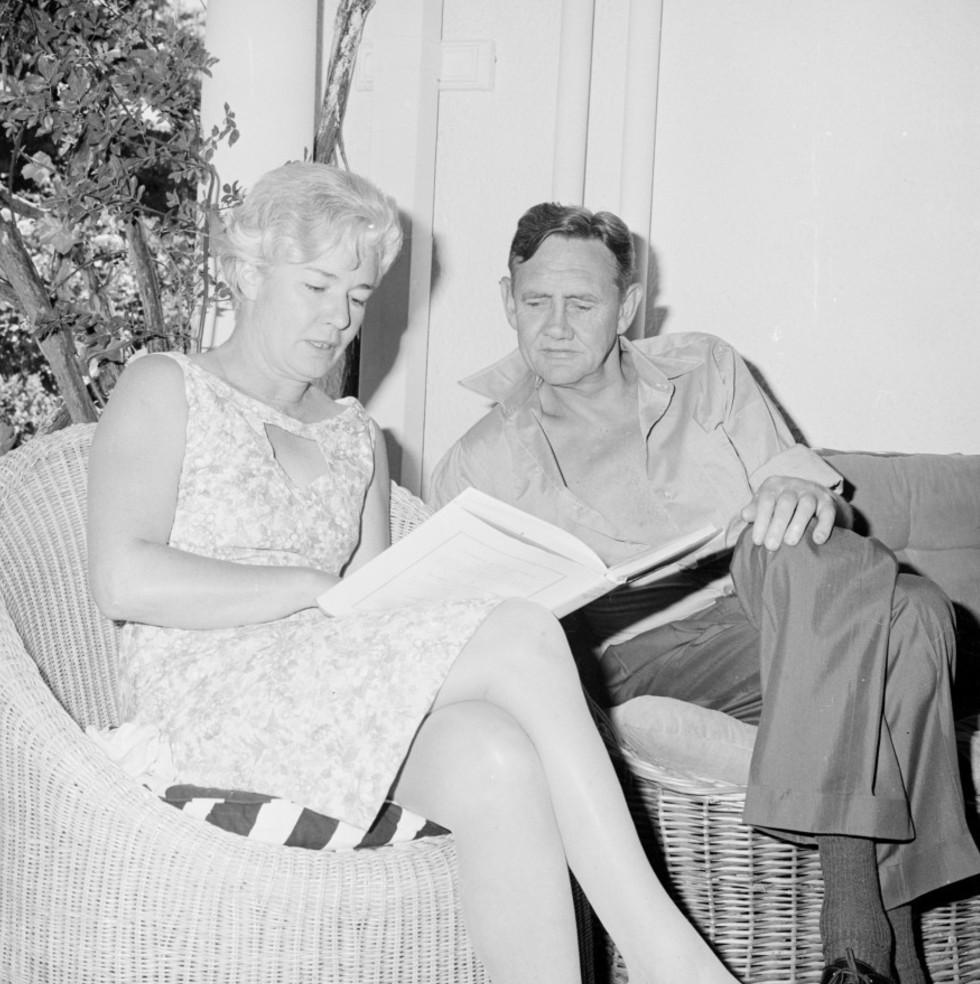 John and Bettina Gorton relax on cane chairs and read books together at The Lodge. NAA: A1200, L68921