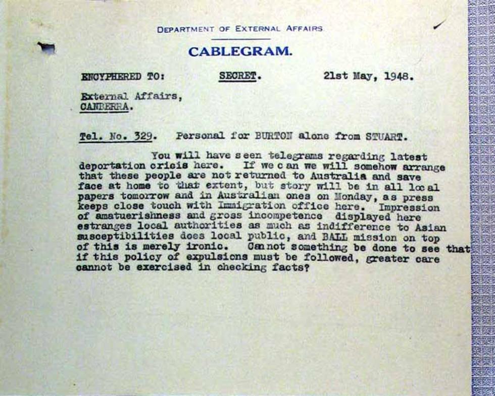You will have seen telegrams regarding latest deportation crisis here. If we can we will somehow arrange that these people are not returned to Australia and save face at home to that extent, but story will be in all local paper tomorrow and in Australian ones on Monday, as press keeps close touch with Immigration office here. Impression of amateurishness and gross incompetence displayed here estranges local authorities as much as indifference to Asian susceptibilities does local public, and BALL mission on top of this is merely ironic. Cannot something be done to see that if this policy of expulsions must be followed, greater care cannot be exercised in checking facts?