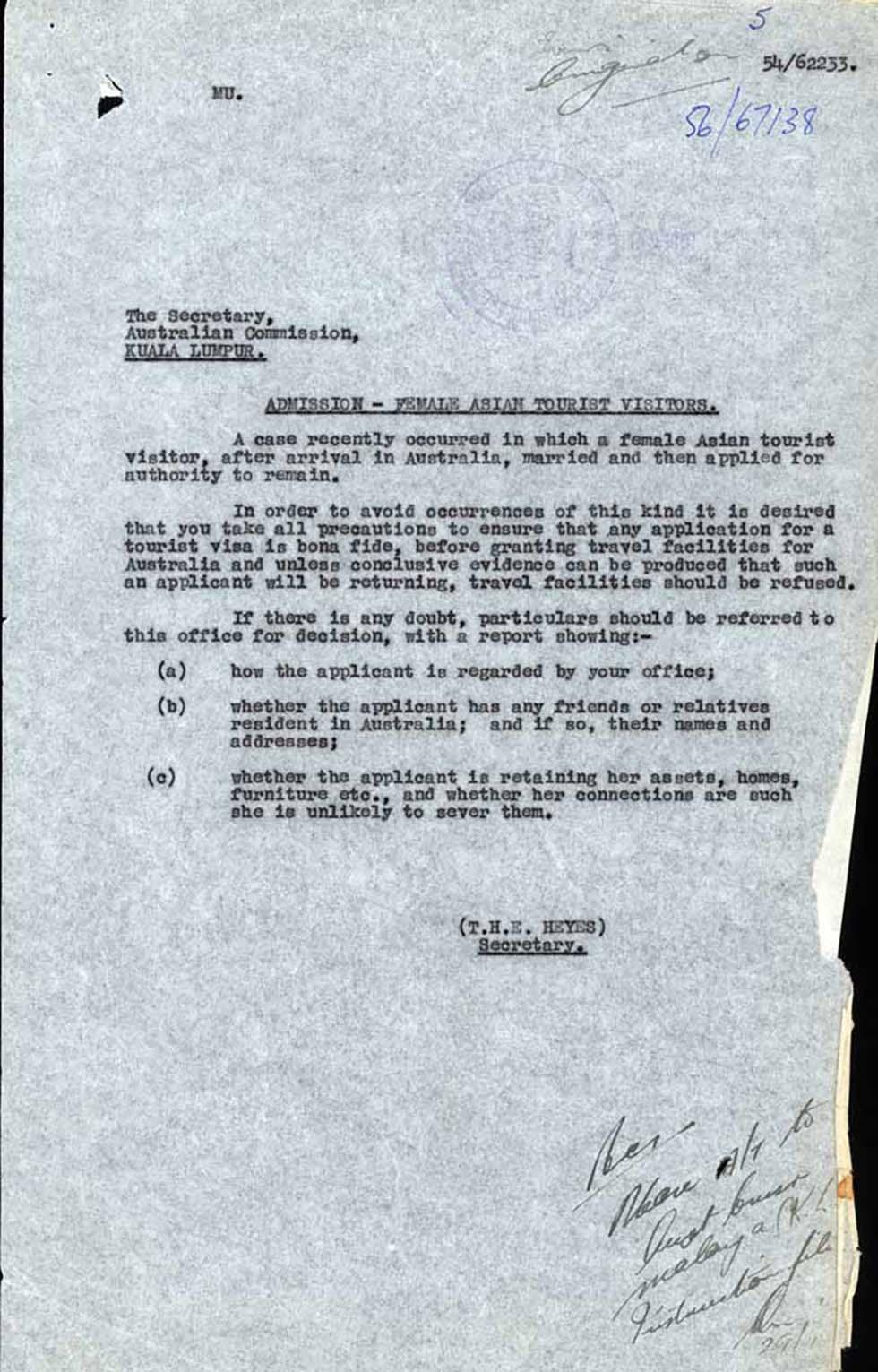 In order to avoid occurrences of this kind it is desired that you take all precautions to ensure that any application for a tourist visa is bona fide, before granting travel facilities for Australia and unless conclusive evidence can be produced that such an applicant will be returning, travel facilities should be refused.