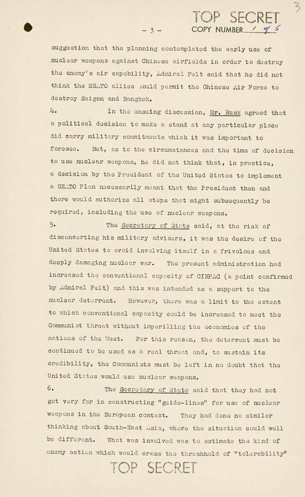4. In the ensuing discussion, Mr. Rusk [underlined] agreed that a political decision to make a stand at any particular place did carry military commitments which it was important to foresee. But, as to the circumstances and the time of decision to use nuclear weapons, he did not think that, in practice, a decision by the President of the United States to implement a SEATO Plan necessarily meant that the President then and there would authorize all steps that might subsequently be required, including the use of nuclear weapons.