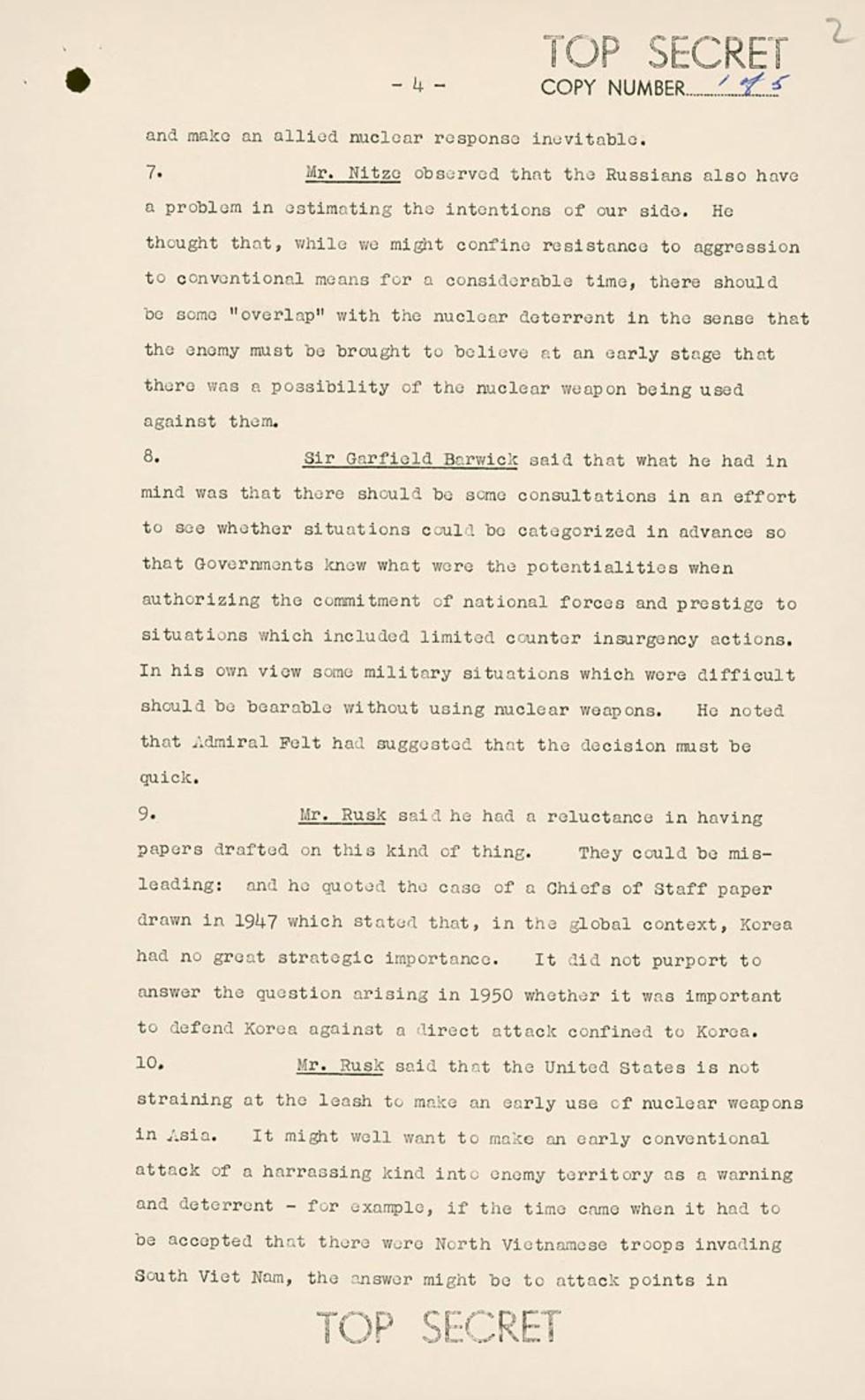 10. Mr. Rusk [underlined] said that the United States is not straining at the leash to make an early use of nuclear weapons in Asia. It might well want to make an early conventional attack of a harrassing [sic] kind into enemy territory as a warning and deterrent – for example, if the time came when it had to be accepted that there were North Vietnamese troops invading South Viet Nam, the answer might be to attack points in