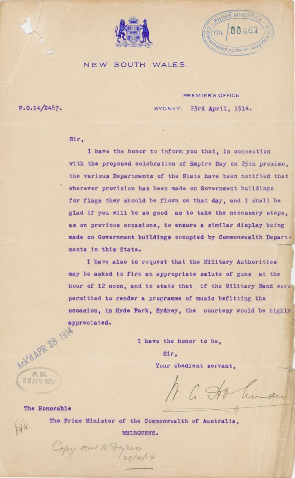 This letter from New South Wales Premier William Holman to Prime Minister Joseph Cook, dated 23 April 1914, outlines the arrangements being made for the official celebration of Empire Day in Sydney the following month.