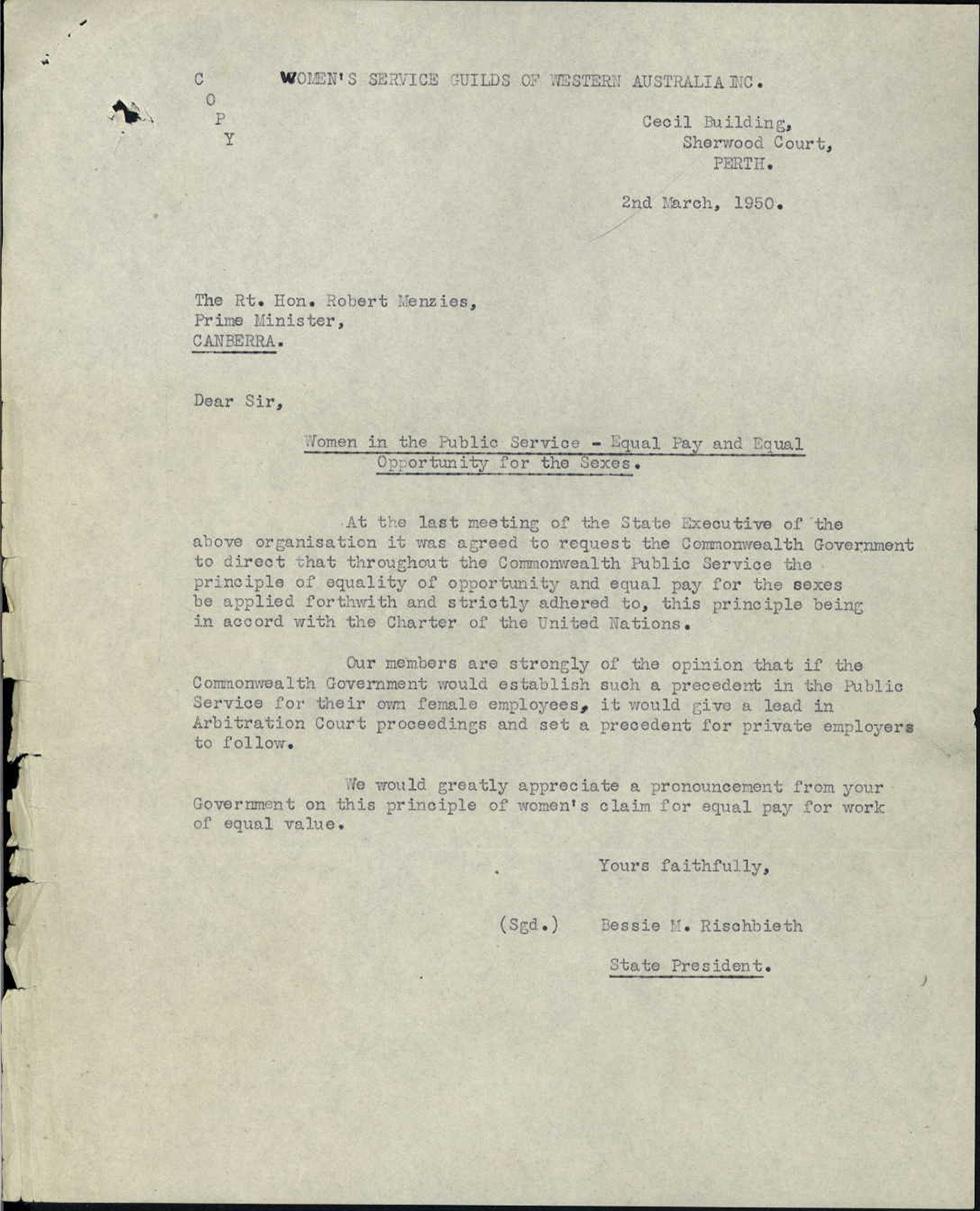 In 1950, equal pay for women did not exist in the Commonwealth Public Service or in almost any other Australian workplace. Women had been seeking equal pay for equal work since the 19th century and Rischbieth and the Women’s Service Guilds of Western Australia were active in the campaign. When this letter was written, the Commonwealth Court of Conciliation and Arbitration was holding a periodic basic wage inquiry that was to include more debate about equal pay.