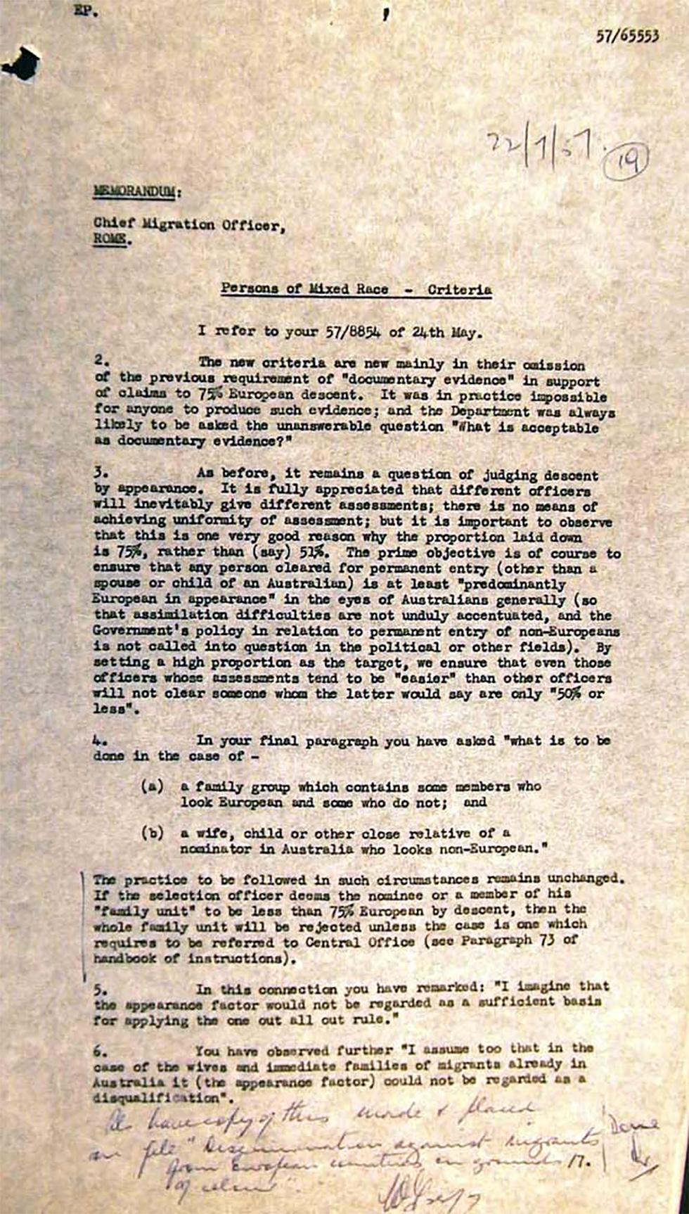 8. Naturally in this as in other fields we have to be even more careful in regard to families of residents of Australia than in the case of others; and it will occasionally be found that after referring such case here, with reports which seems to indicate rejection, you will receive requests for more information or advice that the family may be accepted. Such requests ad decisions in individual cases are not to be taken as having or bearing on general policy.