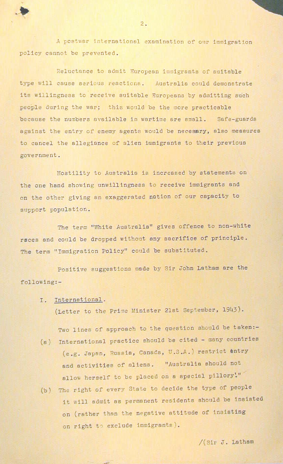 The term "White Australia" gives offence to non-white races and could be dropped without any sacrifice of principle. The term "Immigration Policy" could be substituted.