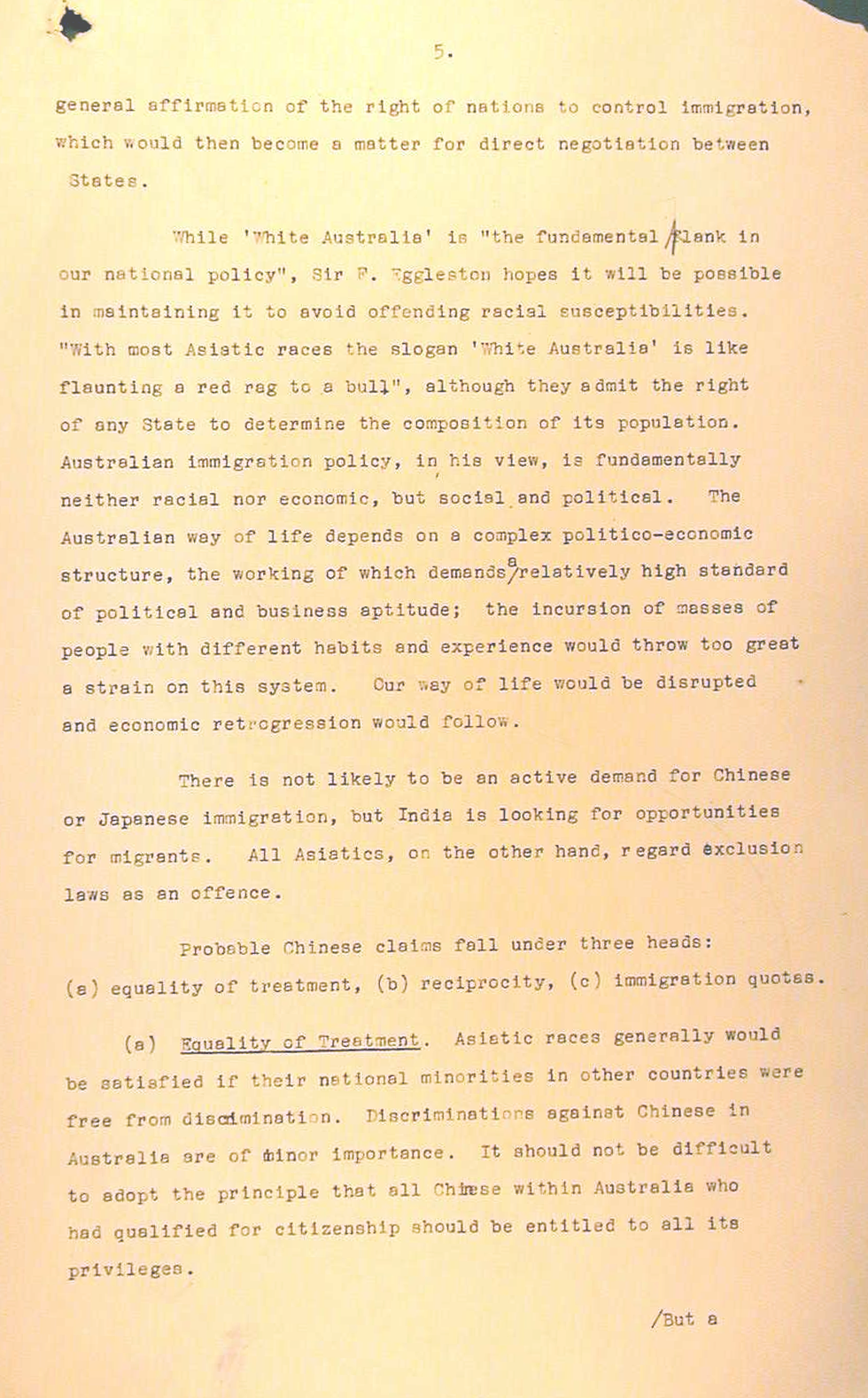 (xiv) The Chinese will probably claim (a) equality of treatment, (b) reciprocity, (c) immigration quotas. Sir F. Eggleston thinks it would be politic to abandon many of the restrictions on the activities of Chinese nationals living in Australia, excepting those ….